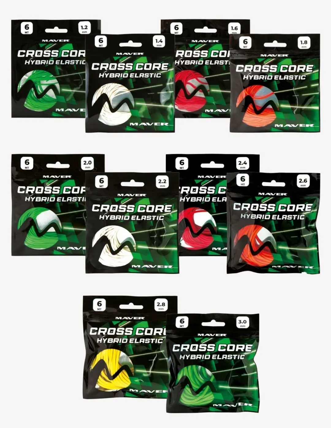 Der neue Cross Core Hybrid Elastic Gummi wurde unter Verwendung einer speziellen Mischung aus reinen Latexpolymeren hergestellt, die dem Produkt ein ausgezeichnetes Fließverhalten, einen sehr hohen Dehnungsgrad und eine nicht unerhebliche Haltbarkeit verleihen: 800% Dehnungsverhältnis; Pigmentierung mit neutralen Farben und MAT-Finish, die eine gleichbleibend glatte und progressive Mechanik garantiert; neutrale Pigmentierung mit MAT-Finish, die besonders wirksam gegen Abnutzung durch die Intensität der UV-Strahlen ist; Beutel mit Frischhalteverschluss und mit einer Aluminiumfolie überzogen, die das in der Verkaufsstelle exponierte Gummiband vor Sonne und Hitze schützt und dafür sorgt, dass es seine Leistung über lange Zeit beibehält; Sie werden in Größen von 1,2 mm bis 3,0 mm in 5 verschiedenen Farben hergestellt. Die verfügbaren Durchmesser decken alle Angelsituationen ab, vom Angeln auf Weißfische in Kanälen und Flüssen bis hin zum Sommerangeln auf große Karpfen.